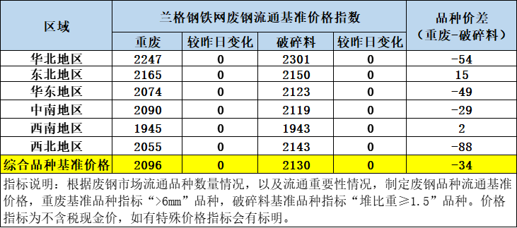 1月14日兰格钢铁网废钢流通基准价格指数为2113平:其中重废品种综合基准价格指数为2096平,破碎料品种综合基准价格指数为2130平。分区域华北地区重废2247(0)破碎料2301(0);东北地区重废2165(0)破碎料2150(0);华东地区重废2074(0)破碎料2123(0);中南地区重废2090(0)破碎料2119(0);西南地区重废1945(0)破碎料1943(0);西北地区重废2055(0)破碎料2143(0)。