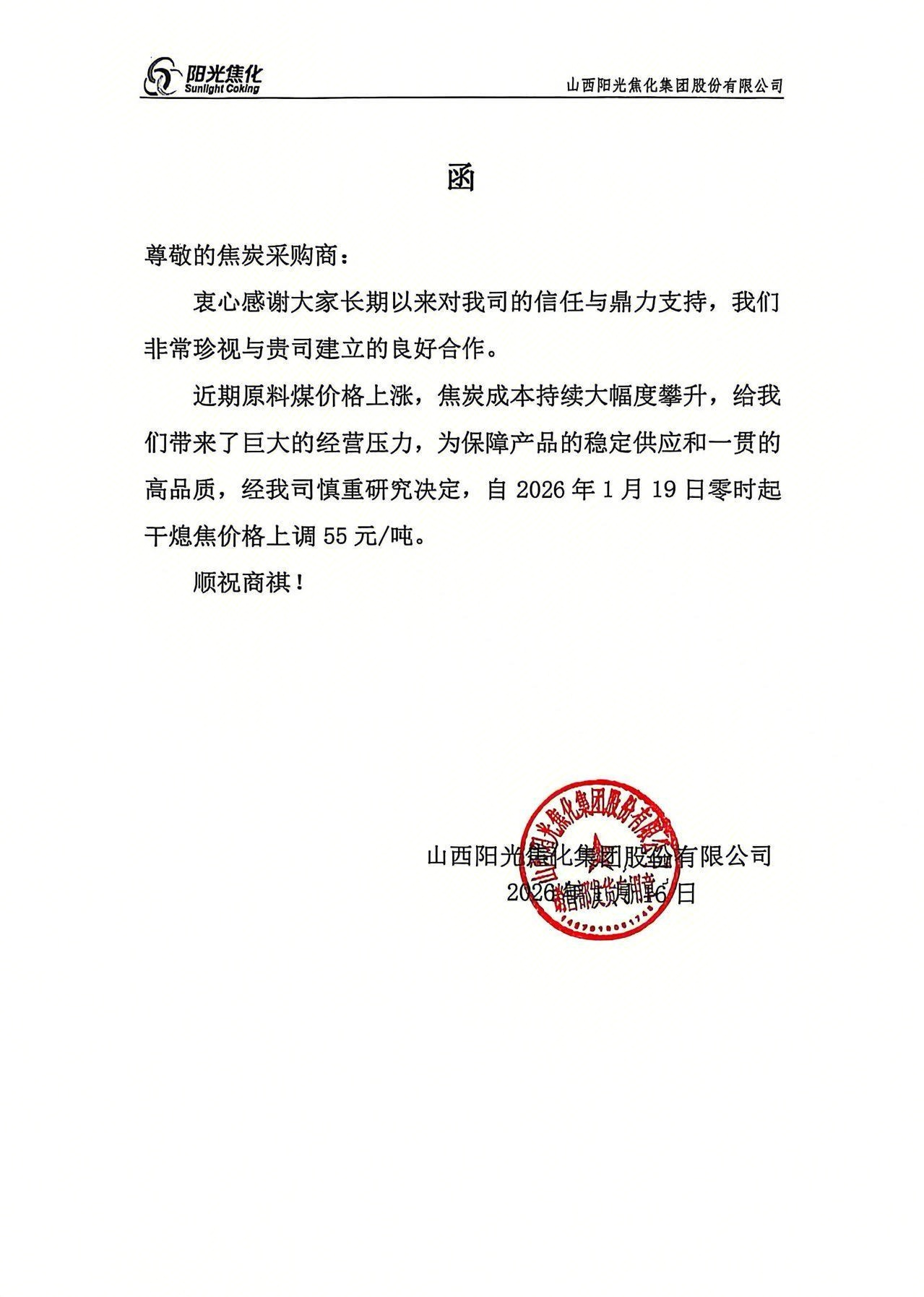 近期原料煤价格上涨,焦炭成本持续大幅度攀升,给我们带来了巨大的经营压力,为保障产品的稳定供应和一贯的高品质,经我司慎重研究决定,自2026年1月19日零时起干熄焦价格上调55元/吨。