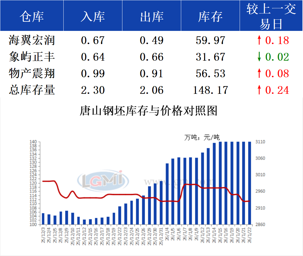截至今晨,唐山地区样本仓库钢坯库存总量约148.17万吨,单日入库总量2.30万吨,出库总量2.06万吨。