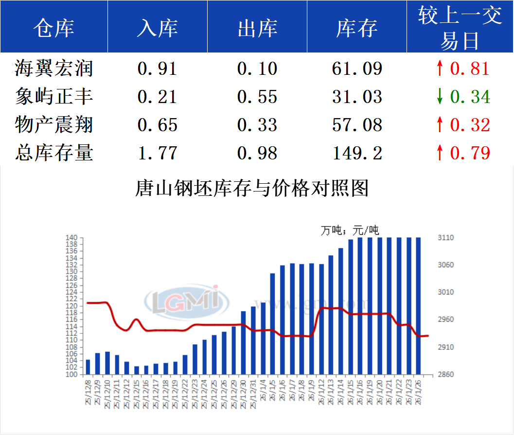 截至今晨,唐山地区样本仓库钢坯库存总量约149.2万吨,单日入库总量1.77万吨,出库总量0.98万吨。