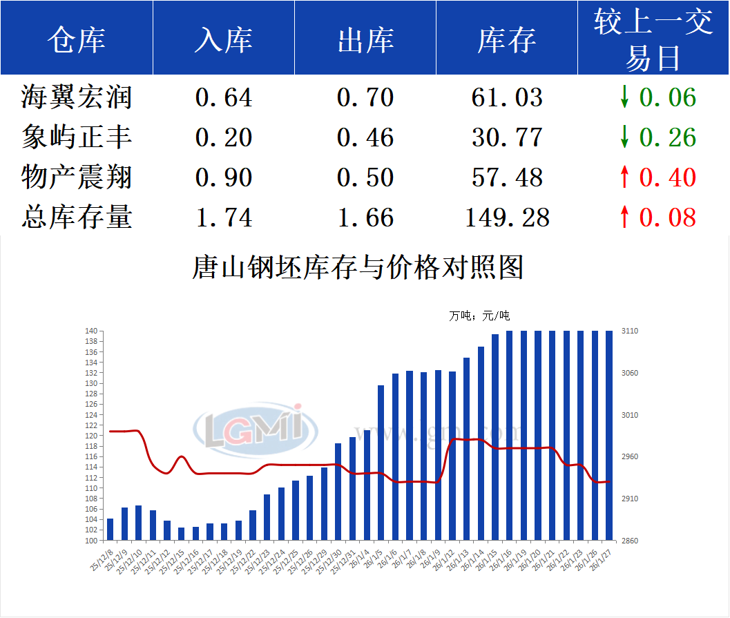 截至今晨,唐山地区样本仓库钢坯库存总量约149.28万吨,单日入库总量1.74万吨,出库总量1.66万吨。