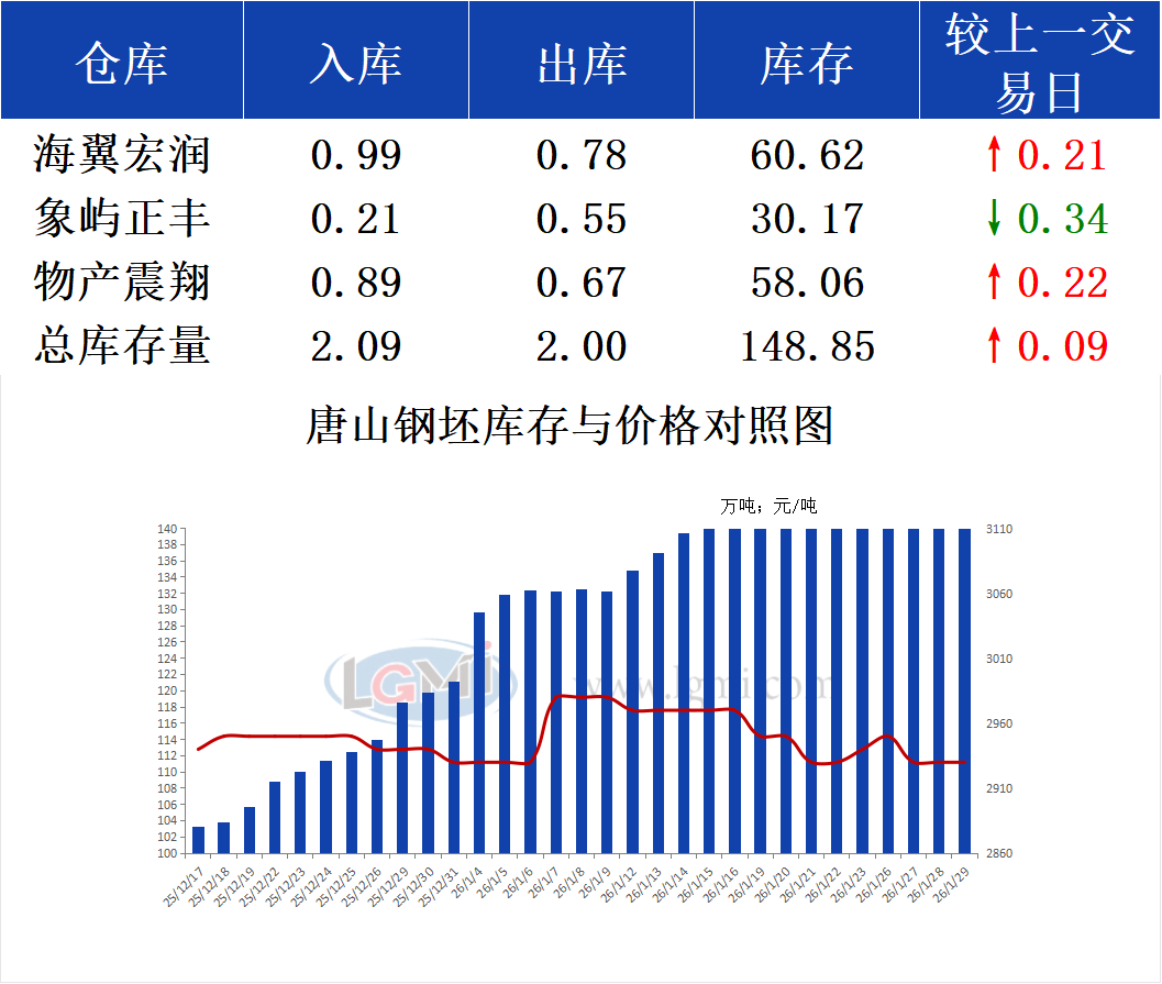 截至今晨,唐山地区样本仓库钢坯库存总量约148.85万吨,单日入库总量2.09万吨,出库总量2万吨。