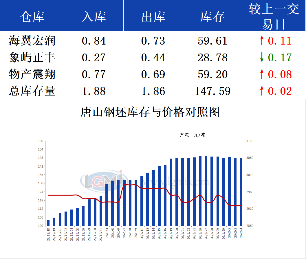 截至今晨,唐山地区样本仓库钢坯库存总量约147.59万吨,单日入库总量1.88万吨,出库总量1.86万吨。