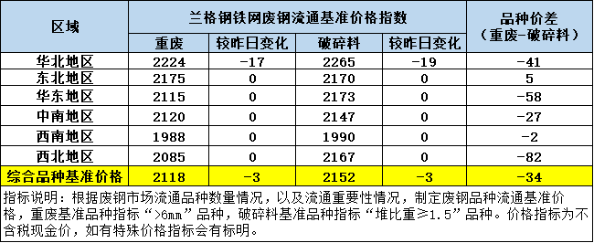 2月6日兰格钢铁网废钢流通基准价格指数为2135跌3:其中重废品种综合基准价格指数为2118跌3,破碎料品种综合基准价格指数为2152跌3。分区域华北地区重废2224(-17)破碎料2265(-19);东北地区重废2175(0)破碎料2170(0);华东地区重废2115(0)破碎料2173(0);中南地区重废2120(0)破碎料2147(0);西南地区重废1988(0)破碎料1990(0);西北地区重废2085(0)破碎料2167(0)。