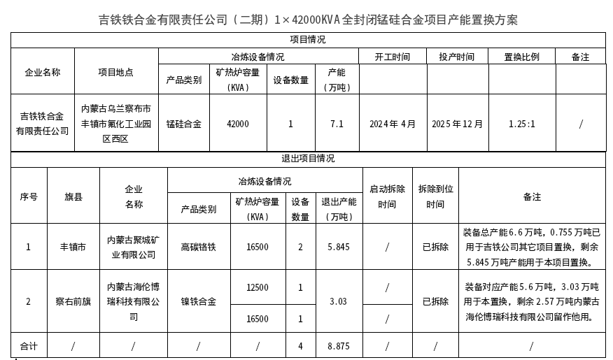 吉铁铁合金有限责任公司锰硅合金项目产能置换方案公示