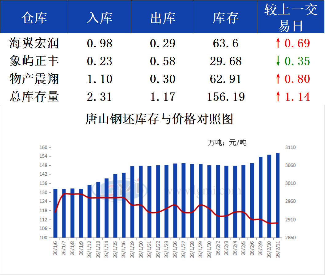 截至今晨,唐山地区样本仓库钢坯库存总量约156.19万吨,单日入库总量2.76万吨,出库总量1.27万吨。