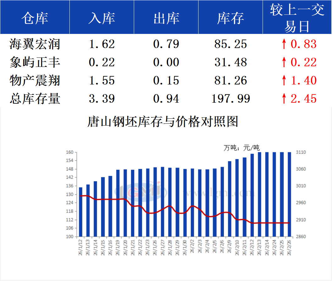 截至今晨,唐山地区样本仓库钢坯库存总量约197.99万吨,单日入库总量3.39万吨,单日出库总量0.94万吨。