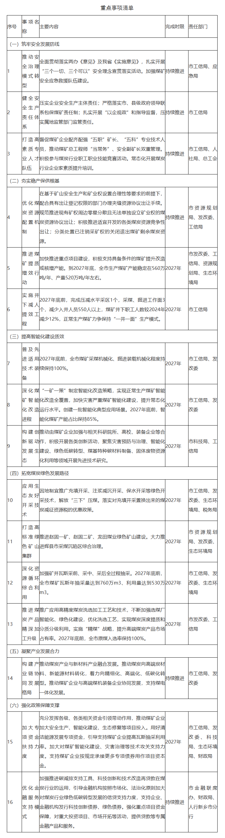 市直有关部门和有关县(市)要加强协调配合,形成工作合力,做好进度调度、跟踪评估、督促检查和经验总结等工作。市发改委要统筹做好煤炭清洁高效利用等工作;市资源规划局要统筹做好煤炭资源配置、绿色矿山建设、用地保障等工作;市工信局要统筹做好煤矿安全生产、行业管理等工作;市科技局要统筹做好科技攻关支持等工作;有关县(市)政府、煤矿企业要确保如期完成各项目标任务,持续推动煤炭行业安全高质量发展。