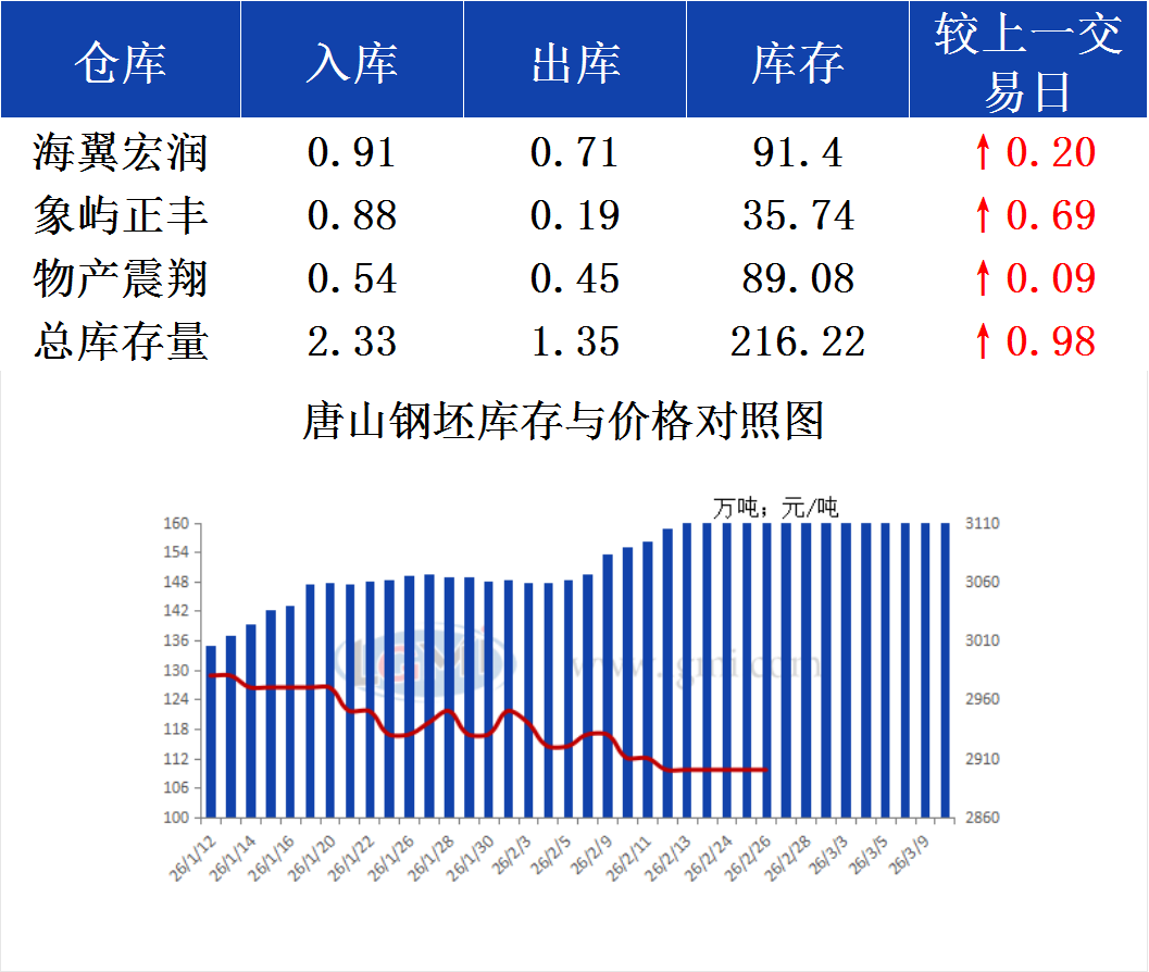 截至今晨,唐山地区样本仓库钢坯库存总量约216.22万吨,单日入库总量2.33万吨,单日出库总量1.35万吨。