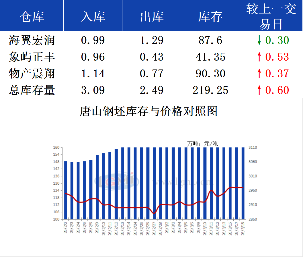 截至今晨,唐山地区样本仓库钢坯库存总量约219.25万吨,单日入库总量3.09万吨,出库总量2.49万吨。