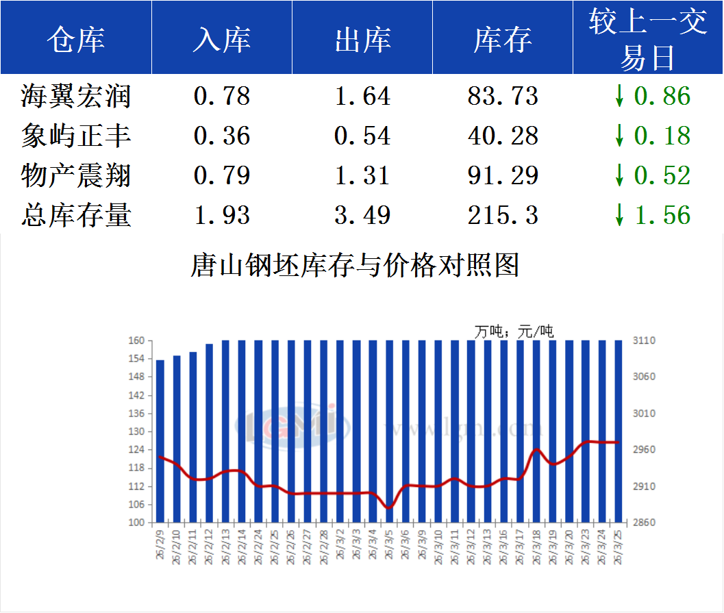 截至今晨,唐山地区样本仓库钢坯库存总量约215.3万吨,单日入库总量1.93万吨,出库总量3.49万吨。