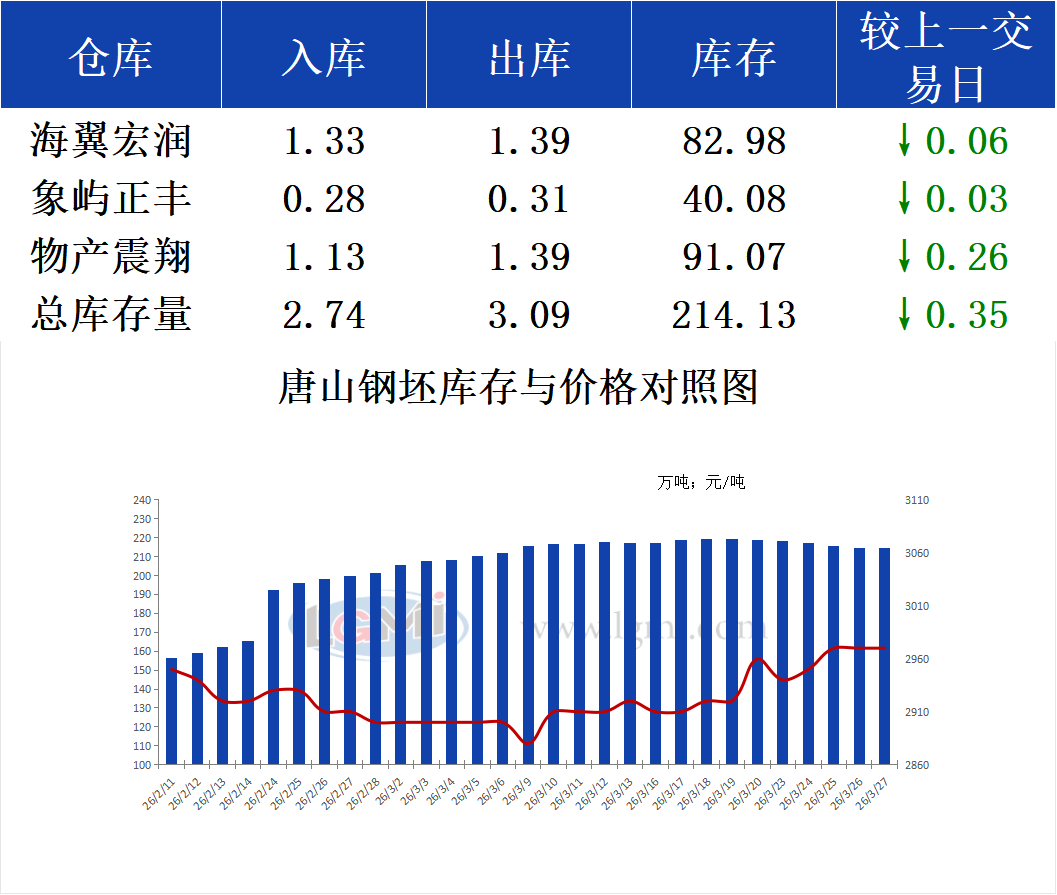 截至今晨,唐山地区样本仓库钢坯库存总量约214.13万吨,单日入库总量2.74万吨,出库总量3.09万吨。