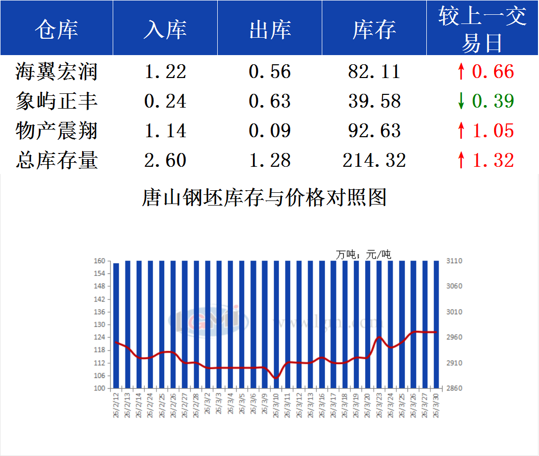 3月30日唐山钢坯库存早报