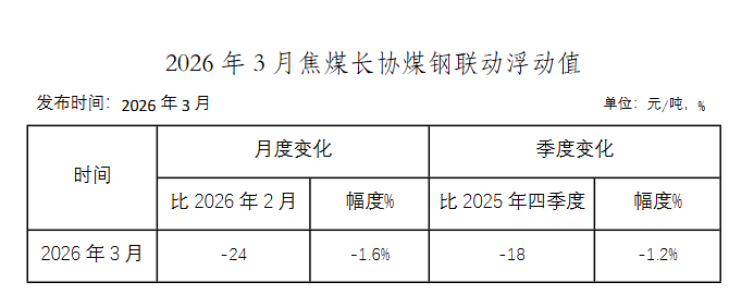 按照焦煤长协煤钢联动方案数据测算,2026年3月焦煤长协煤钢联动浮动值发布如下: