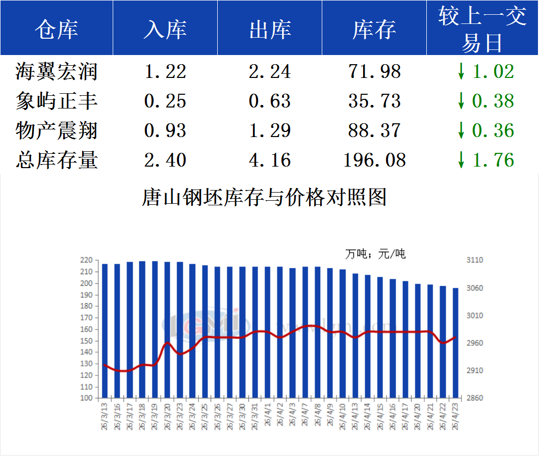 截至今晨,唐山地区样本仓库钢坯库存总量约196.08万吨,单日入库总量2.4万吨,出库总量4.16万吨。