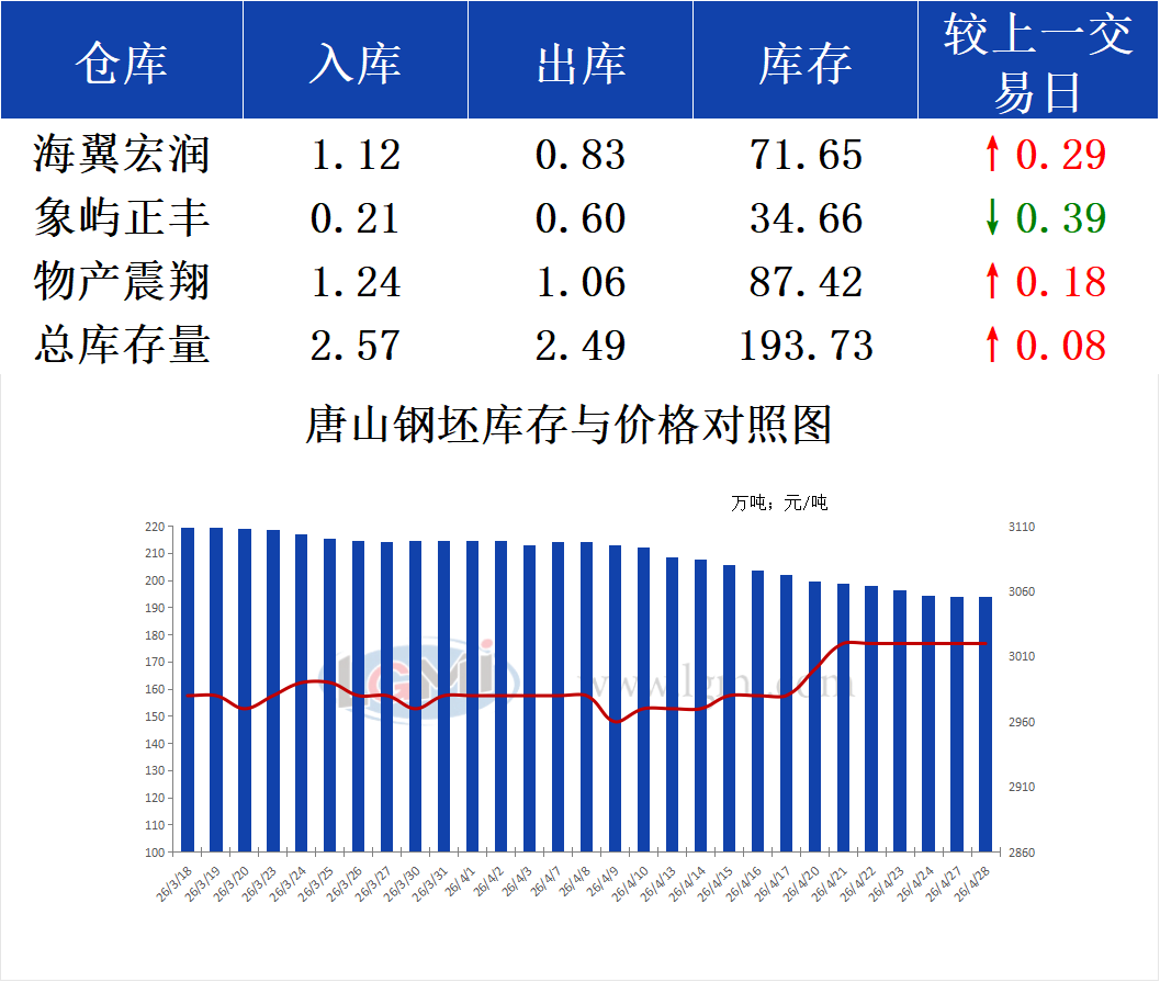 截至今晨,唐山地区样本仓库钢坯库存总量约193.73万吨,单日入库总量2.57万吨,出库总量2.49万吨。